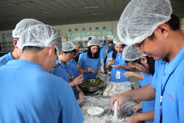 拓展訓練結束,大學生齊聚一堂,開展集體包餃子活動,各小組積極參與,配合密切,搟面、調餡、包餃子等各程序進行的井然有序,忙得不亦樂乎的同時有的還擔任著“現(xiàn)場教學任務”,為身邊的小伙伴傳授新技能,整個現(xiàn)場暖意融融,手指躍動間,一盤盤餃子在歡聲笑語中紛紛成型。通過此活動,讓大家親身感受到了過程中團隊合作的樂趣,享受到了孚日大家庭的溫暖。