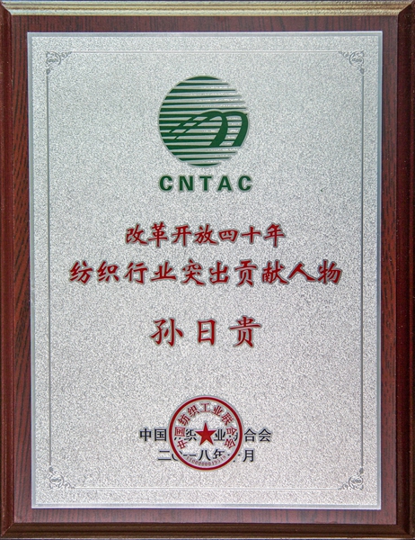 2018年10月16日,中國紡織工業(yè)聯(lián)合會(huì)第四屆第四次常務(wù)理事擴(kuò)大會(huì)議在上海召開,公布140位“改革開放40年紡織行業(yè)突出貢獻(xiàn)人物”。 中國紡織工業(yè)聯(lián)合會(huì)特邀副會(huì)長、孚日控股集團(tuán)董事長孫日貴榜上有名、登臺(tái)領(lǐng)獎(jiǎng)。