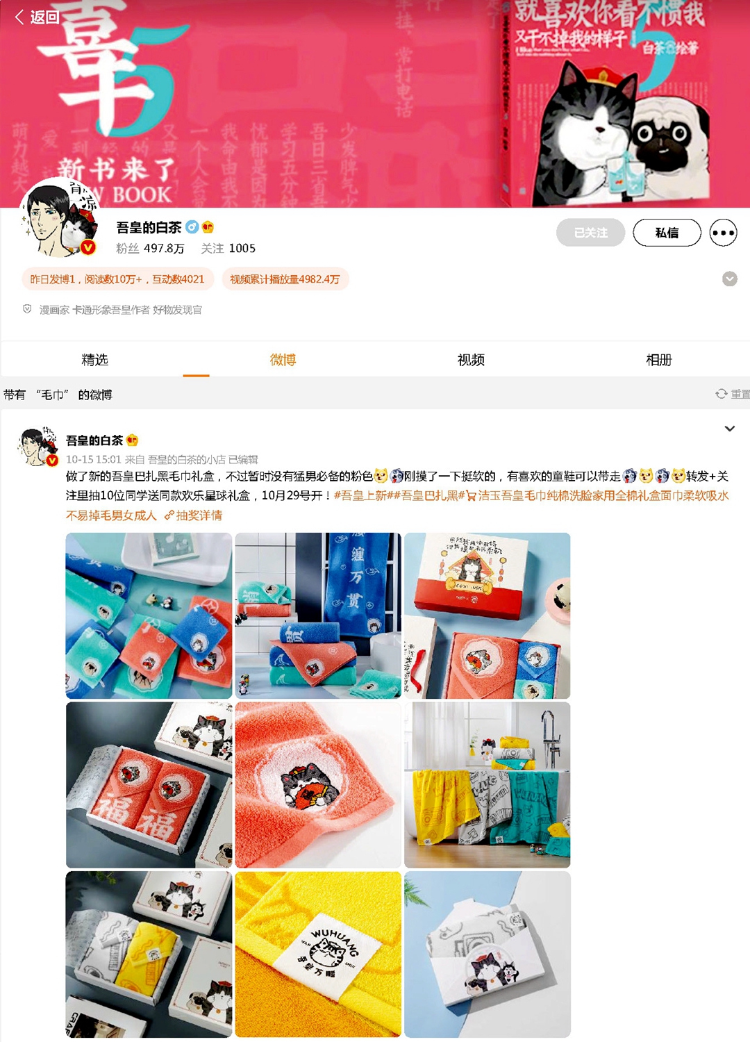 2021年10月15日,漫畫(huà)家、卡通形象吾皇作者“吾皇的白茶”發(fā)布微博,稱(chēng)“做了新的吾皇巴扎黑毛巾禮盒,不過(guò)暫時(shí)沒(méi)有猛男必備的粉色,剛摸了一下挺軟的,有喜歡的童鞋可以帶走”,配圖赫然正是孚日集團(tuán)攜手“吾皇萬(wàn)睡”新推出的傲嬌巾品。