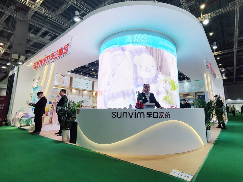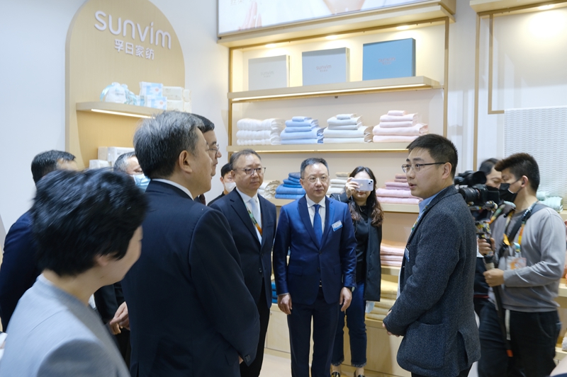(圖為孚日集團(tuán)副總經(jīng)理、國內(nèi)品牌運營總負(fù)責(zé)人孫浩博帶隊參加上海春夏家紡展,中國紡織工業(yè)聯(lián)合會會長孫瑞哲、中國紡織工業(yè)聯(lián)合會副會長、中國家用紡織品行業(yè)協(xié)會監(jiān)事長楊兆華參觀孚日展位)